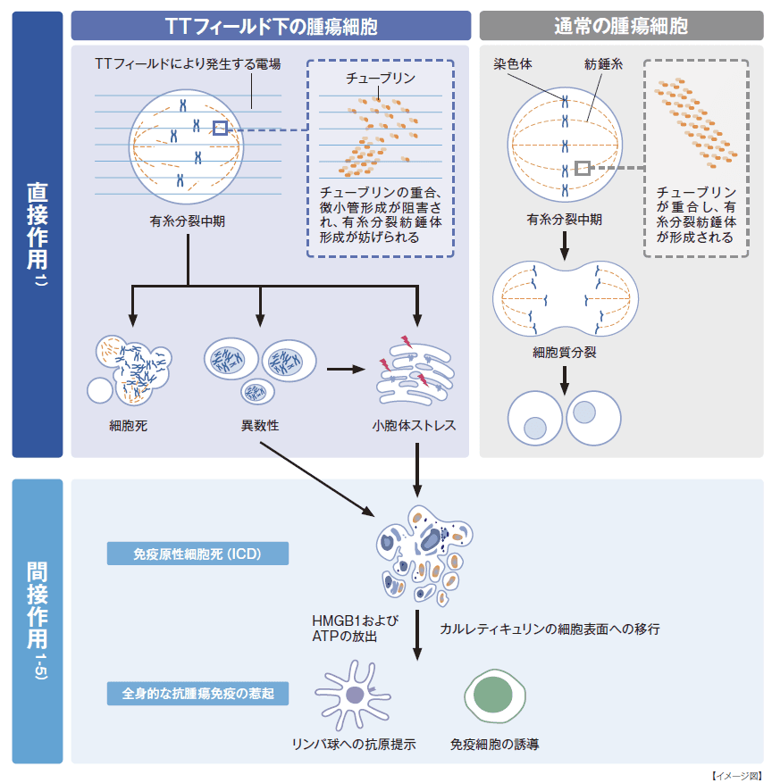 直接作用は交流電場によってチューブリン重合が阻害されることによる腫瘍細胞の増殖抑制作用、間接作用は交流電場によって小胞体ストレスを受けた細胞が免疫原性細胞死(Immunogenic cell death; ICD)を起こすことによる全身的な抗腫瘍免疫の惹起作用です。