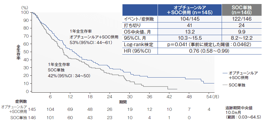 OS中央値は、オプチューンルア+SOC併用群では13.2ヵ月[95%信頼区間(CI):10.3~15.5]、SOC単独群では9.9ヵ月(95%CI:8.2~12.2)でした。