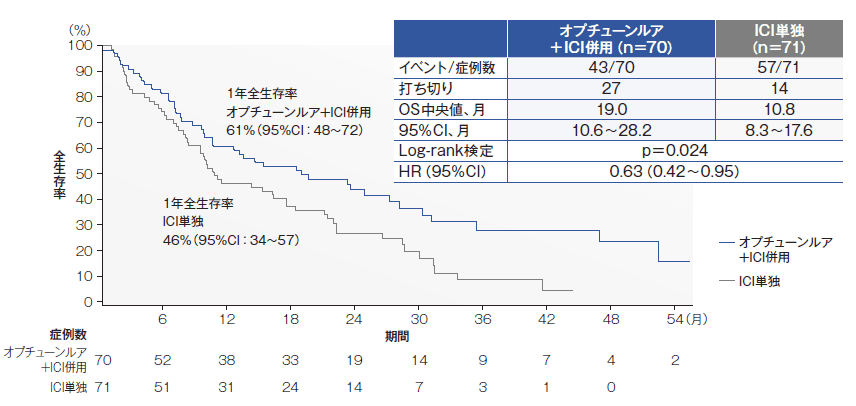 OS中央値は、オプチューンルア+ICI併用群では19.0ヵ月(95%CI:10.6~28.2)、ICI単独群では10.8ヵ月(95%CI:8.3~17.6)でした。