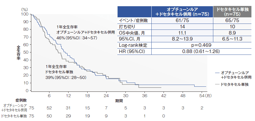 OS中央値は、オプチューンルア+ドセタキセル併用群では11.1ヵ月(95%CI:8.2~13.9)、ドセタキセル単独群では8.9ヵ月(95%CI:6.5~11.3)でした。