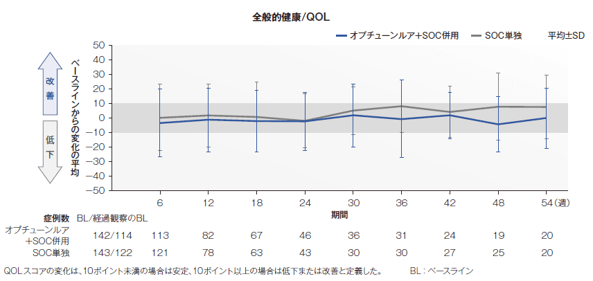 全般的健康/QOLスコアのベースラインからの変化の平均は、両群とも試験期間をとおして10ポイント未満でした。