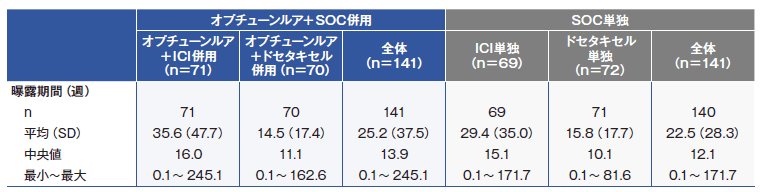 治療期間中央値はオプチューンルア+SOC併用群で13.9週、SOC単独群で12.1週でした。オプチューンルア+ICI併用群で治療期間が最も長く、中央値は16.0週でした。