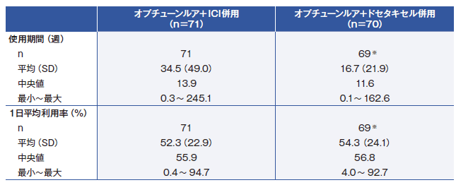 治療期間中央値は、オプチューンルア+ICI併用群で13.9週、オプチューンルア+ドセタキセル併用群で11.6週でした。オプチューンルア治療の1日平均利用率(中央値)はオプチューンルア+ICI併用群で55.9%、オプチューンルア+ドセタキセル併用群で56.8%でした。